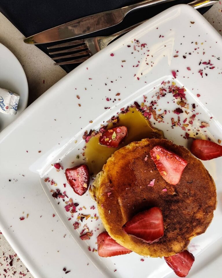 Thick pancakes served with selected delicacies inside and with sauces nearby.