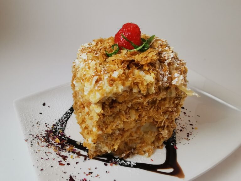 Freshly prepared napoleon from puff pastry, fresh raspberries and light vanilla cream is prepared for each order.