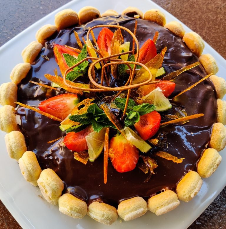 Morkinis tortas perteptas maskarpone kremu ir glaistytas juodu šokoladu su šviežiomis braškėmis bei nuostabiai minkštais biskvitiniais piršteliais!