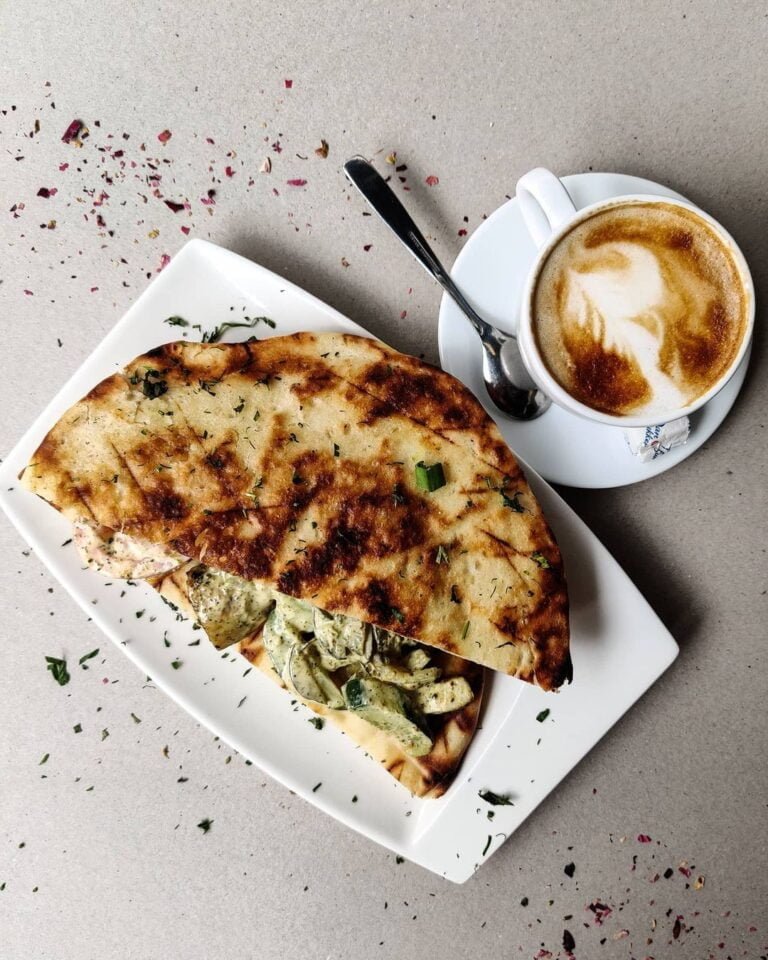 Naminėje pitoje patiektas sumuštinis su ant ugnies kepta Vištiena, marinuotais agurkais, pomidorais, agurkais bei jogurtiniu padažu.