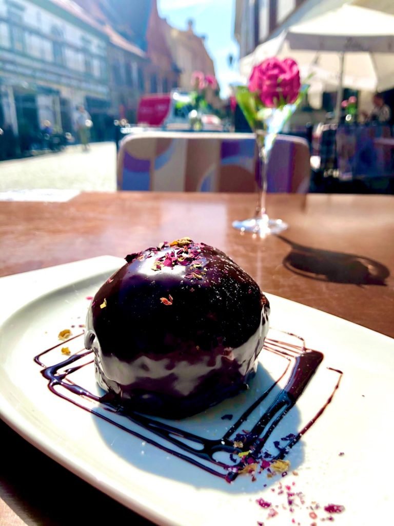 Šokoladinis prieskoningas biskvitas perteptas lengvu jogurtiniu kremu ir pagardintas šviežiomis avietėmis, graikiniais riešutais bei šokoladiniu glaistu.