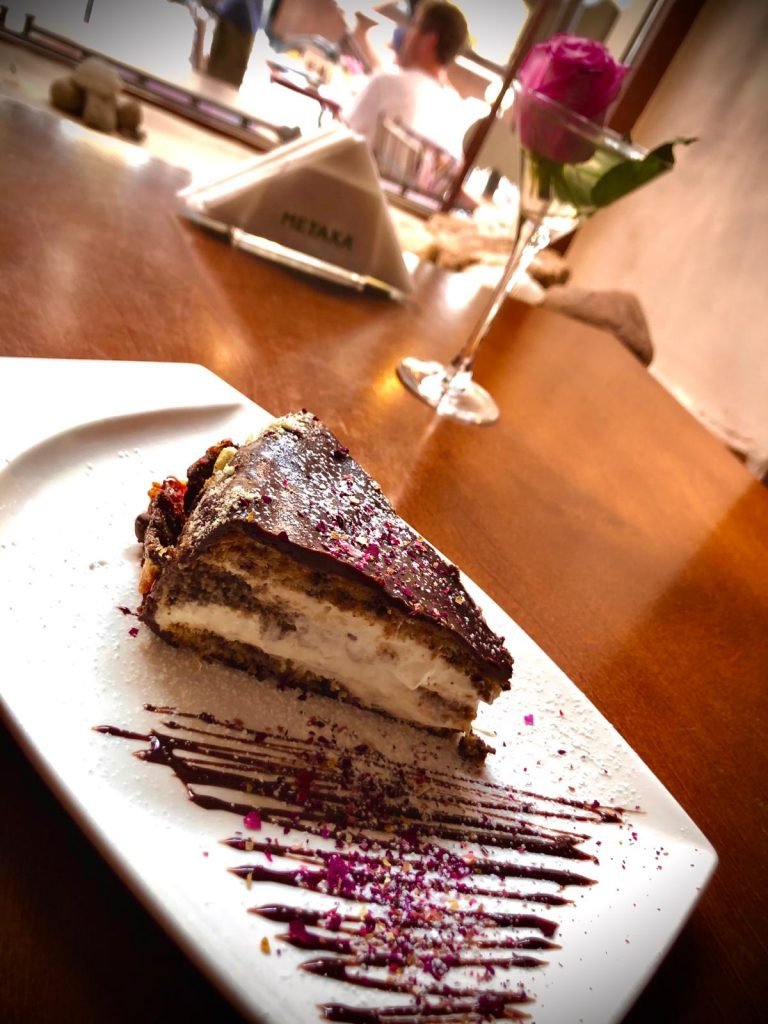 Purus kavos biskvitas perteptas lengvu graikišku jogurtu ir glaistytas tamsiu šokoladu